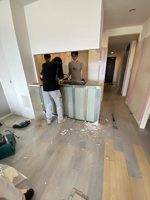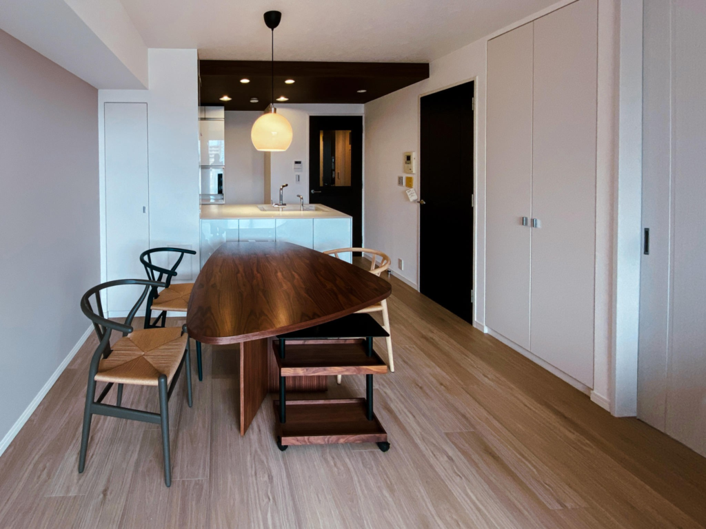 キッチンは垂れ壁と吊戸棚を撤去して、家族とコミュニケーションが取りやすいオープンなペニンシェラキッチンになりました。リビングは脇の小部屋を隔てる引戸部分の垂れ壁を撤去して、リビングと一体感が感じられる広く使える仕様にしています。
